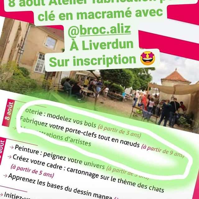 Rendez vous le 8 Aout prochain lors de l’évènement « La cour des artistes » à Liverdun pour participer à un atelier de création de porte clé en macramé.